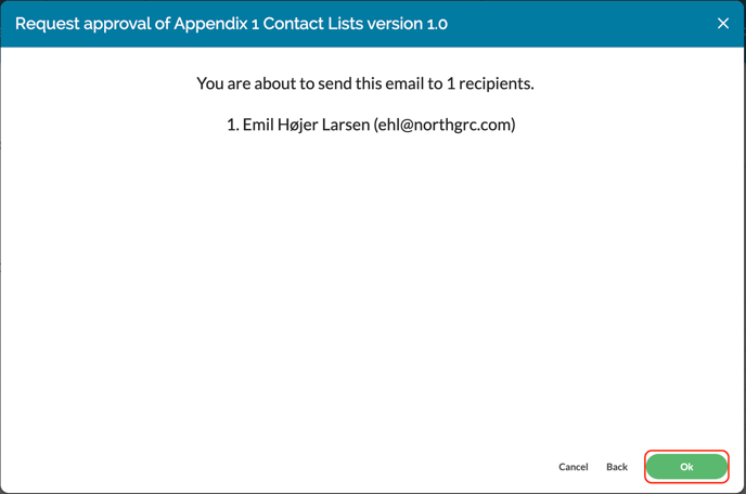 You will then be shown a list of who will be asked to approve the document. Double-check that the correct people are included, or if anyone is missing, before clicking OK to submit the request: