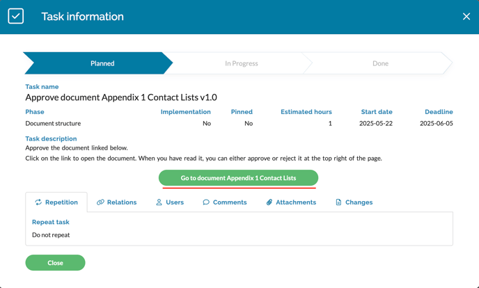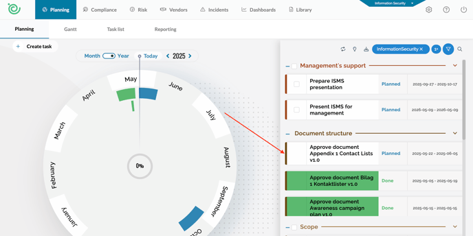 In the planning wheel, a task will also appear for the person who needs to approve the document: